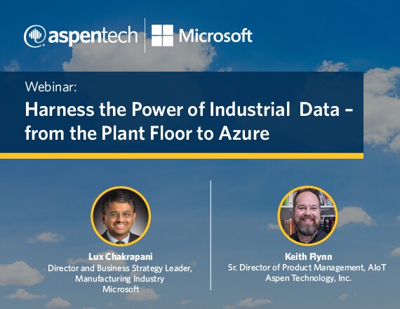 This on-demand webinar featuring Lux Chakrapani, Director and Business Strategy Leader, Manufacturing Industry at Microsoft, and Keith Flynn, Sr. Director of Product Management, AIoT at AspenTech, explains how Azure and Aspen Enterprise InfoPlus.21® (IP.21), help you integrate data – from sensors to the edge and cloud. Watch it to learn how this powerful solution helps you:
